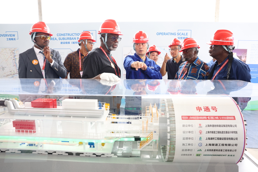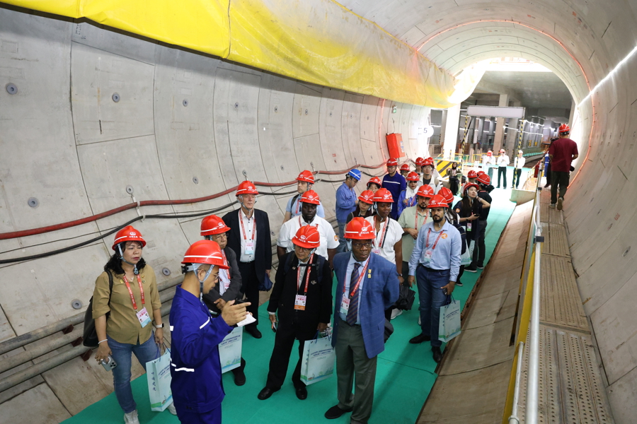 “欢迎大家从世界各地齐聚上海,参观在建的城市轨道交通工程!23号线一期工程景联路站及相连区间,设置了4个展示点,请观摩我们的设计建造技术成果。期待在交流中碰撞思维火花,共同为全球城市轨道交通事业发展添砖加瓦。”37位外宾上午抵达在建的景联路站后,申通地铁建设集团副总经理陆晨致欢迎辞,随后由中铁五局海外事业部员工介绍技术成果。