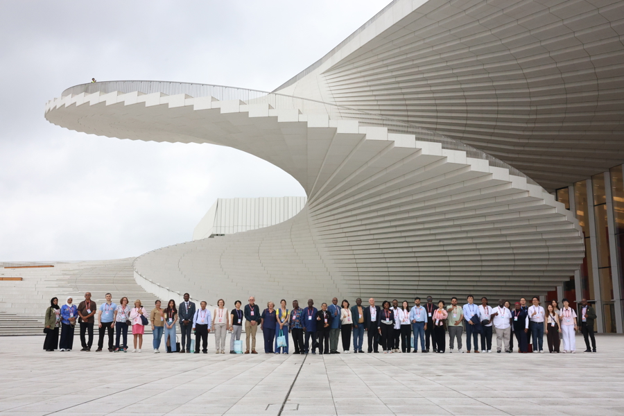 外宾参访团在上海大歌剧院的双螺旋楼梯前合影。