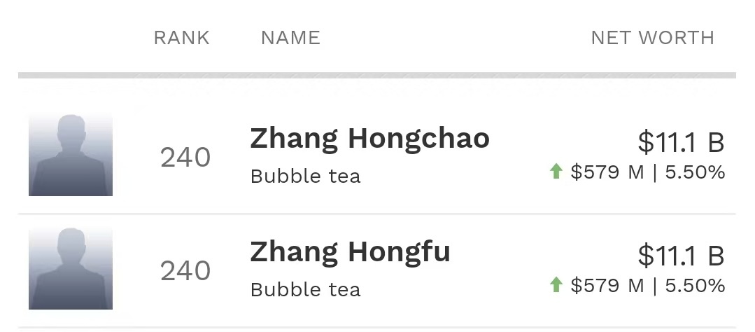 被很多人忽略的是,根据该榜单,同样来自河南的蜜雪冰城,其创始人张红超、张红甫两兄弟净资产也分别达到111亿美元,一度登上福布斯当日涨幅前三名。